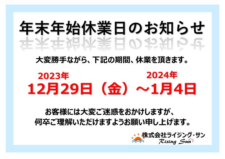 2023年も残りわずかになりました。 弊社の年末年始休暇のお知らせになります。 2023年(令和5年)12月29日(金)~ 2024年(令和6年)1月4日(木) 上記期間はお休みとさせていただきます。 なお年明けの営業は2024年(令和6年)1月5日(金)より通常時間からになります。 |