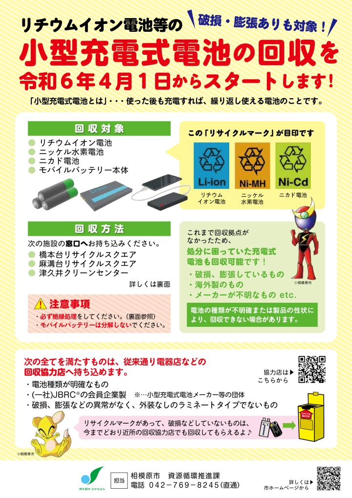 相模原市役所 資源循環推進課 発行 小型充電式電池ゴミ処理方法についてのチラシが配布されました。※相模原市 2024年4月1日より施行されるようです。 皆さんご確認下さい。
